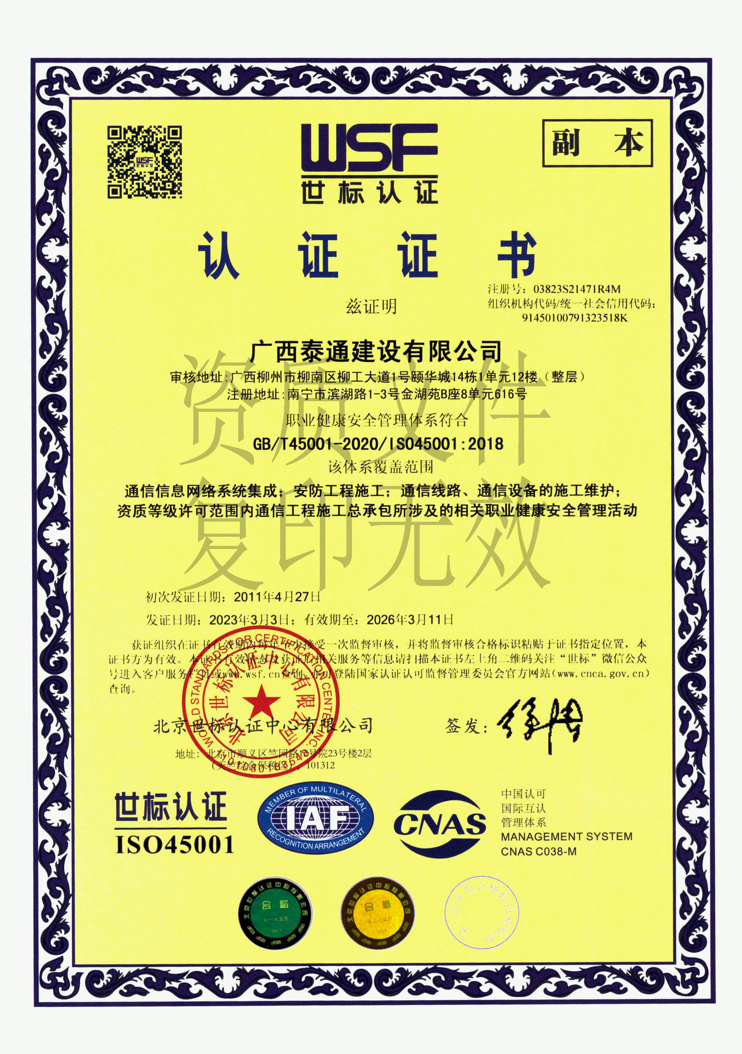 职业健康管理体系认证证书