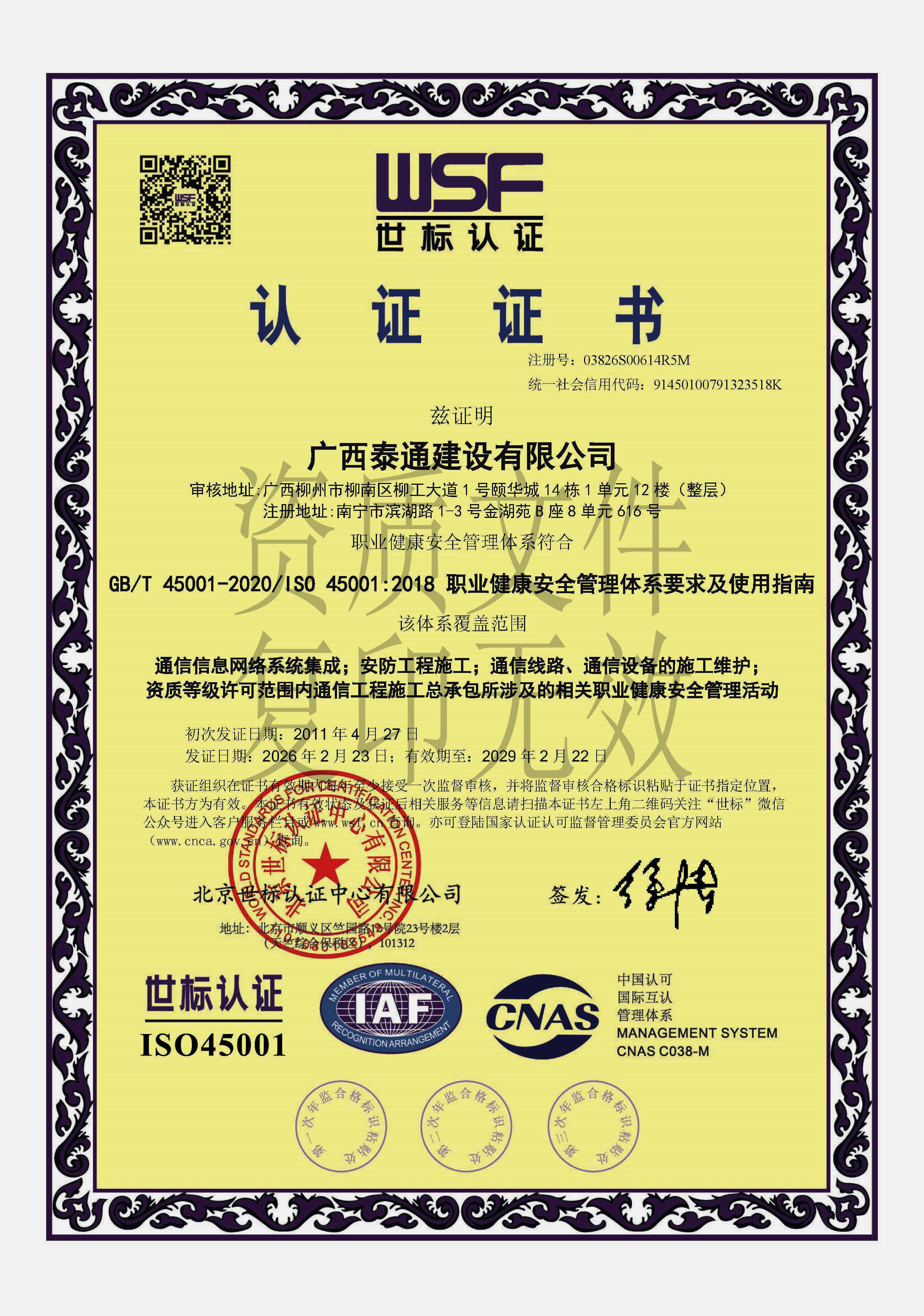职业健康管理体系认证证书